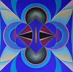 The inspiration for Mahirwan Mamtani's conception of "Centrovision" is derived from the manifestation of tantric doctrines. Emanating from the centre toward the outside, his forms are akin to the mandala concept, the visual manifestation of which are based on the axiom of microcosm versus macrocosm. The feeling of procreation is evoked by the rhythmical arrangement of symmetrical, curvilinear organic forms, the roots of which could be traced in the form of the female, the symbol of Shakti, the supreme cosmic energy. Instead of having a flux of light, the paintings are permeated with the whispering tonal values achieved through the integration of colour hues with soft light which becomes the essential ingredient for the modulation of pulsating circular forms.