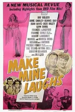 Make Mine Laughs is a 1949 American musical comedy film directed by Richard Fleischer. The film was a compilation of comic scenes and musical numbers from RKO Radio Pictures' feature films and short subjects of the mid-1940s. It was the second of RKO's four "musical revue" features, composed largely of musical and comedy highlights from previous RKO productions. Comedian Gil Lamb hosts the proceedings, finding time to make satirical comments about the opening credits and to perform his "swallowing the harmonica" specialty.