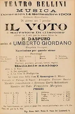 Mala vita (Wretched Life) is an opera in three acts composed by Umberto Giordano to a libretto by Nicola Daspuro adapted from Salvatore Di Giacomo's and Goffredo Cognetti's verismo play of the same name. Giordano's first full-length opera, Mala vita premiered on 21 February 1892 at the Teatro Argentina. It was subsequently performed in Naples, Vienna, Berlin and Milan, and various Italian cities over the next two years. In 1897 a considerably re-worked and revised version under the title Il voto (The Vow) premiered in Milan. Within a few years, both versions had disappeared from the repertoire. Amongst its rare modern revivals was the 2002 performance at the Teatro Umberto Giordano in Foggia which was recorded live and released on the Bongiovanni label.