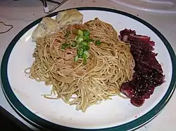 - Yusheng (Chinese: 魚生) - a festive raw fish salad, also pronounced yee sang in the Cantonese manner. While raw fish preparations are thought to have existed in China during antiquity and can be found in the Chaoshan region of Guangdong province in modern times, yusheng was created and developed in Singapore in 1964 when the republic was still a member state of the Federation of Malaysia.[9] It consists of strips of raw fish tossed at the dining table with shredded vegetables, crispy tidbits and a combination of sauces and condiments. Yusheng literally means "raw fish" but since "fish (魚)" is commonly conflated with its homophone "abundance (餘)", Yúshēng (魚生) is interpreted as a homophone for Yúshēng (余升) meaning an increase in abundance. Therefore, yusheng is considered a symbol of abundance, prosperity and vigor. As a result, the mixing and tossing of yusheng with chopsticks and the subsequent consumption of the salad has become ritualised as part of the commemoration of Chinese New Year festivities in Malaysia and Singapore.