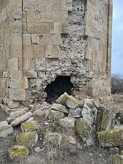 Its walls are thoroughly revetted with sharpened stones from inside and outside. But its sepulcher is quadrangular from the inner side. The door of the mausoleum is located at a height of 1.8 meters. The inner arch has a spherical, but the external a pyramidal form. Such types of constructions are typical for many monuments of Azerbaijan.