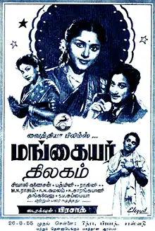 Mangaiyar Thilakam (transl. A Jewel Among Women) is a 1955 Indian Tamil-language drama film directed by L. V. Prasad. The film, released on 26 August 1955, was a remake of the 1953 Marathi film Vahinicha Bangadya.[1] The film was produced by Sripadha Shankar under the banner of Vaidya films. It stars Sivaji Ganesan and Padmini, while M. N. Rajam, S. V. Subbaiah, K. A. Thangavelu and K. Sarangapani play pivotal roles. The film's soundtrack and background score were composed by S. Dakshinamurthi, while the lyrics for the songs were written by Kannadasan, Puratchidasan, and Maruthakasi. P. L. Rai and N. M. Shankar handled cinematography and editing respectively. The story was adapted by Sadasiva Brahmam and dialogues were written by Valampuri Somanathan, G. Ramakrishnan and D. Nagalingam.
