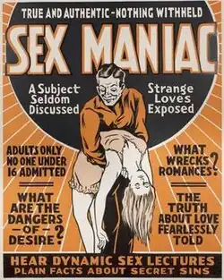 Maniac (also known as Sex Maniac) is a 1934 American independent[1] black-and-white exploitation horror film directed by Dwain Esper[2] and written by Hildagarde Stadie, Esper's wife, as a loose adaptation of the 1843 Edgar Allan Poe story "The Black Cat", with references to his "Murders in the Rue Morgue".[3] Esper and Stadie also made the 1936 exploitation film Marihuana.