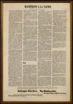 Manifiesto a la Nación is a document written by Francisco I. Madero on 5 October 1910 in San Luis Potosí, México. The text begins with a message directed to the Mexican people and describes a plan in twelve articles. The first article declares invalid the elections from June and July 1910 for president, vice president, magistrates to the Supreme Court of Justice of the Nation, deputies and senators. In the second article he disowned the government of Porfirio Díaz and all the authorities unelected by the people.
