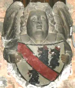 - "MCCCXC. Hic jacent Joh(ann)es Baunfeld et Agnes uxor eius, pat(er) et mat(er) Will(ielm)i Baunfeld, qui ha(n)c eccl(es)ia(m) et maxima(m) campana(m) fieri fecer(u)nt" ("1390. Here lie John Bampfield and Agnes his wife, the father and mother of William Bampfield, who caused to come into being this church and the greatest bell"). The arms are Bampfield impaling Pederton: Argent, a bend gules between three lion's heads erased and ducally crowned sable.[23]