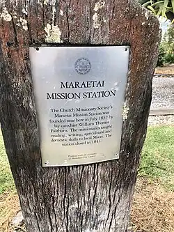 Maraetai Mission Station was a Church Missionary Society founded mission based in Maraetai, Auckland, that operated between 1837 and 1842. It was founded and operated by William Fairburn, an English carpenter and lay preacher, until his resignation from the mission in December 1841. A school operated alongside the mission station, and was taught by Fairburn's wife Sarah and their daughter Elizabeth. At this school, Māori children, primarily Ngāi Tai and Ngāti Paoa, but also from other surrounding iwi, were taught reading, writing and arithmetic. The children were dressed in European clothing, and were taught the English alphabet by singing it to the tune of 'God Save the Queen'.[1]