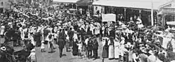 A large crowd gathered and cheers rang out, as did the fog-signals from the trains in the Woolloongabba railway yards (now part of the South East Busway).[27] The Railway Band led the march of the Dungarees down Stanley Street on 30 November 1915. Enthusiastic crowds gathered in every doorway and veranda, and flags fluttered overhead.[28]