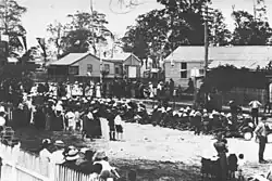 By the time the Dungarees reached Goodna, they were hot and dusty. They were welcomed at the Goodna Recreation Reserve by the chairman of the Purga Shire Council. The crowds included children from the Redbank and Goodna State Schools, the Goodna Convent School and a large number of residents travelling in buggies.[24]