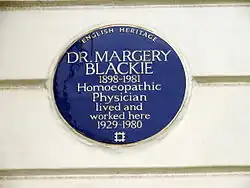 In 1929, together with Dr. Banks, she moved to a large six-storey house at 18 Thurloe Street, South Kensington, London, where they maintained a busy homoeopathic medical practice in addition to Dr. Blackie's hospital work. She remained there until 1980, the year before her death.[3] Dr. Blackie and Dr. Banks were both ardent Christians, and for over thirty years Banks was her "partner and intimate friend".[4] Dr. Banks died in 1971.