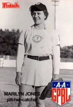 Marilyn Charlotte Jones [Doxey] (April 5, 1927 – July 22, 2015) was an American pitcher and catcher who played from 1948 through 1954 in the All-American Girls Professional Baseball League. Listed at 5 ft 5 in (1.65 m), 135 lb (61 kg), she batted and threw right-handed.[1]