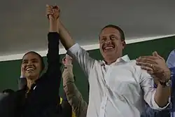 Silva was a member of the PT until 2009, and served as a senator before becoming Minister of the Environment in 2003. She ran for president in the 2010 Brazilian elections as the candidate for the Green Party, coming in 3rd with 19% of the first-round vote.[2] In April 2014, Eduardo Campos announced his candidacy for the fall 2014 presidential election, naming Marina Silva as his vice presidential candidate.[3] After Campos's death in a plane crash on August, she was selected to run as the Socialist Party's candidate for the presidency, winning 21% of the vote and coming in 3rd.[4][5] She again ran for president in the 2018 election, this time as the nominee for the Sustainability Network, finishing in 8th place with 1% of the vote.