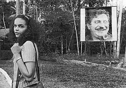 Silva in the Amazon rainforest, Acre, with a picture of Chico Mendes in the background