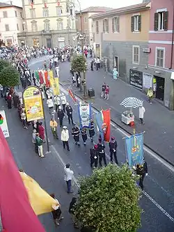 For the 1931 Sagra, Il Piccolo calculated a turnout of nearly 50,000 people.[15] On the occasion of the 1932 Sagra, the Turkish shield preserved in the Basilica of San Barnaba was once again carried in procession.[16] On the occasion of the ninth edition of the Sagra, on Sunday, October 1, 1933, the Ferrovie dello Stato and the Roman Castles tramways granted the application of the reduced popular fare for the routes between Rome and Marino.[16]