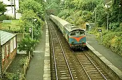 A NIR 101 Class diesel locomotive hauls a passenger train into Marino station in 1983
