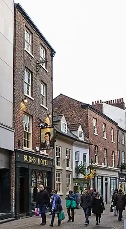The notable buildings on the street lie on the south-eastern side: 15 Market Street is a four-storey, mid-19th century building, while 21 Market Street is early 18th-century, and the Burns Hotel is mid-19th century.[2][4] Conversely, the modern buildings at 8-10 Market Street and 20 Market Street are labelled "poorer examples" by the City of York Council.[3]