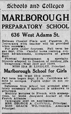 4. ^ "Marlborough School". Los Angeles Evening Express. September 17, 1890. Retrieved March 14, 2024.