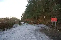 There was an anti-aircraft battery near High Marley Hill during World War II, and a drift mine which closed in the 1960s, as did the nearby Byermoor Colliery.[18] The 1951 OS map shows an opencast mine in the field beside the road, near the farm (marked on the map as Longfield House) and there is an embankment which runs parallel to School House Lane, from the site of the drift to the remains of a large retaining wall. This was presumably a loading point on the Bowes Railway, the trackbed of which is still visible, running alongside St. Cuthbert's Road. The presence of a large flat area of waste ground on the opposite side of the road to the wall is a possible indication there were railway sidings here. It is not known whether this loading point also handled the output of the opencast. The 1951 map also shows a terrace called Waggonway Row just beside the retaining wall. The outline of these houses can be seen from the air and is visible on Google Maps. The large house on School House Lane has several outbuildings which appear to have been associated with the drift. This would explain the presence of a sign on the wall of the building nearest the road which reads "UK Coal Monitoring Station." Exactly what this is monitoring is unclear, although it is likely to be mine water or gas. School House Lane forms the southern end of St. Cuthbert's Road, and vehicular access beyond the large house is prevented by a large concrete block which has been placed in the centre of the lane.