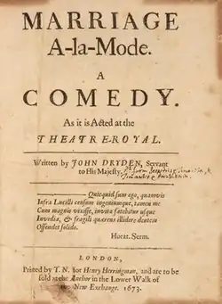 Marriage à la Mode is a Restoration comedy by John Dryden, first performed in London in 1673 by the King's Company. It is written in a combination of prose, blank verse and heroic couplets. It has often been praised as Dryden's best comedic endeavour, and James Sutherland accounts for this by observing that "the comic scenes are beautifully written, and Dryden has taken care to connect them with the serious plot by a number of effective links. He writes with ... one of the most thoughtful treatments of sex and marriage that Restoration comedy can show."[1]