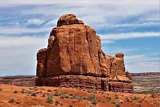 Mars Hotel is located within Arches National Park,[3] and like many of the rock formations in the park, it is composed of Entrada Sandstone, specifically the Slick Rock Member overlaying the Dewey Bridge Member.[4] It is among the first features that the main park road passes by. Topographic relief is significant as the summit rises approximately 250 feet (76 meters) above the surrounding terrain in 500 feet (152 meters) laterally. Precipitation runoff from Mars Hotel drains to the nearby Colorado River via Courthouse Wash. The first ascent of the summit was made in March 1989 by Kyle Copeland and Eric Johnson via If I Only Had A Brain rock-climbing route (class 5.10).[5] Mike Baker and Leslie Henderson climbed a new route in 1992 on the east face, Lost in Space (class 5.10+).[2][6]