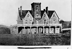 A highlight of the park is the home of John Marsh, which was begun in 1853 and completed in 1856, and which has been undergoing extensive renovation for several years. Marsh was the first non-Hispanic white settler to live in the county.[15] The property encompassed by Marsh Creek State Park was part of Rancho Los Meganos, (Los Meganos is a Spanish phrase meaning "sand dunes"), which Marsh acquired in 1838. Initially, Marsh lived in a four-room adobe house which had been built on the property for him by local Miwok Indians. Marsh apparently got along well with the Miwoks and had even provided them with free medical care. In return, the tribesmen built the adobe house.[16] After he married Abby[a] Tuck in 1851, he retained San Francisco architect Thomas Boyd to design a grand new mansion. Many of the features apparently were stipulated by Marsh himself.[14] John's wife, Abby, had selected the site for the house along Marsh Creek. The new Gothic Revival style house was three stories high and had an observation tower that rose 65 feet (20 m) into the air. Marsh built the tower so that he could see the approach of strangers from a great distance. Rustlers and marauders frequently came to his ranch to steal cattle or steal other valuables. However, the stone tower proved vulnerable to earthquakes. The original tower collapsed during the 1868 Hayward earthquake. It was rebuilt with wood, but the replacement collapsed again after the 1906 quake.[16] Images from the Historical American Building Survey (HABS) collection in the Library of Congress shown here depict the differences in the two structures. This house is the earliest substantial building in Contra Costa County that was not built entirely of adobe.[14]