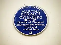 An English Heritage blue plaque at the site of Bergman-Österberg's original physical training college in South Hampstead, London.