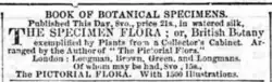 Three octavo volumes of British plants have been presented by Miss Jackson. The interest in these is bibliographical, as there is a printed title page giving publisher's name and date (1847); there is also a printed preface.The title reads "Specimen Flora or British Botany exemplified by Plants from a Collector's Cabinet". The plants were "arranged by the author of 'The Pictorial Flora'" [Mary Ann Jackson]. (British English)
