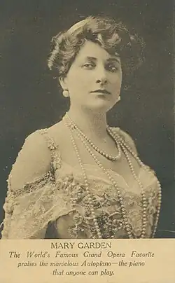 Mary Garden featured on an advertisement for the autopiano, 1910s