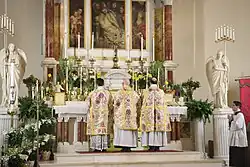 In 2004, following years of economic and demographic decline common to many smaller parishes in the area, the Archdiocese of Boston placed Mary Immaculate on the list of churches designated for possible closure as part of the larger restructuring of the diocese at that time, exciting protest both from the small group of remaining parishioners and from local civic groups who wished to see the historic church saved. Following several years of suspense, in 2006 Cardinal O'Malley announced a new plan: Mary Immaculate would remain open as a non-territorial parish with the specific mission of serving the Tridentine Mass community, particularly the congregation which had been displaced by the closure of Holy Trinity Church in the South End.[28] Thus the parish was saved from extinction in the 136th year of its existence. Fr. Charles J. Higgins, a diocesan priest with experience serving the Tridentine Rite community at Holy Trinity, was named pastor in January 2007. He immediately began needed renovations, including repairing the roof, restoring the 3 historic church bells to working order, and constructing a parish hall in the disused lower church space. Significant restorations were undertaken in the church's interior to restore the original, Tridentine configuration: the tabernacle and a relief sculpture depicting the Last Supper were restored to their original places in the high altar, the marble Novus Ordo altar was replaced with a moveable wooden one, the altar rail and side altars were restored, confessionals were constructed, and a background mural was commissioned for the Lourdes shrine in the interior of the bell tower to replace one which had been painted over in the 20th century. Fr. Higgins oversaw the sale of the former St. Elizabeth Parish Center, which had fallen into a state of disrepair and had been rendered unnecessary by the construction of the parish hall, as well as some surplus land at the parish cemetery, thus stabilizing the finances of the parish. With the arrival of the Tridentine Mass, the parish began to flourish as it had in former times, and today it is a destination for Catholics from across the diocese who wish to participate in its rich liturgical life and burgeoning community.