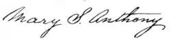 Mary Stafford Anthony was born on April 2, 1827, in Battenville, New York.[1] She was the youngest to survive of four sisters and two brothers.[1] (Her younger sister Eliza Anthony was born in 1832 and died in 1834.) Their parents Daniel and Lucy Read Anthony had different religious backgrounds. He was a liberal Quaker and she was a Baptist; the children were raised as Quakers.[1] The Anthony family and other families in the area were engaged in the American Friends Society's activities.[2] The family worked together to keep up their spirits, for instance, after first moving to their farmhouse with their parents near Rochester.,[3]