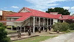 This is a single-storeyed timber residence with verandahs to the southern, eastern and northern sides. It is set on concrete stumps on gently sloping ground. The house is clad in painted weatherboards and features French doors with fanlights, which provide access from the rooms in the main residence to the verandahs, and a mixture of 6:6, 4:4 and 1:1 vertical sliding sash windows to the kitchen and later rear extensions. A concave iron window hood returning at each end protects the triple sash window with louvered shutters on the front projecting gable, which also features bargeboards with supporting brackets along the eaves and a finial at the apex.[1]
