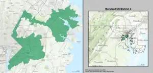 Maryland's 4th congressional district wraps around the eastern edge of Washington, D.C., taking in most of Prince George's County and a small portion of Montgomery County. It is home to several racially diverse middle-class suburbs, including College Park, Fort Washington, Greenbelt, and Laurel. With a median household income of $86,941, it is the wealthiest black-majority district in the United States.[1]