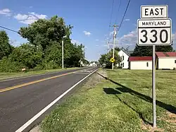 The Maryland State Roads Commission reconstructed Maryland Line Road as a gravel road from the railroad crossing with the Pennsylvania Railroad (now Maryland and Delaware Railroad) to the state line in 1954; however, they decided to leave the highway in the county highway system.[3][4] The whole length of the highway was brought into the state highway system through a December 1, 1987, road transfer agreement.[5] The highway was designated MD 330 in July 1988.[6][7]
