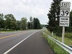 Maryland Route 39 (MD 39) is a state highway in the U.S. state of Maryland. Known for much of its length as Hutton Road, the state highway begins at the West Virginia state line in Hutton, where the highway continues west as West Virginia Route 7 (WV 7). MD 39, which is the westernmost state-numbered highway in Maryland, runs 6.22 miles (10.01 km) from Hutton east through Crellin to U.S. Route 219 (US 219) in Oakland. The state highway was constructed in the early 1920s.