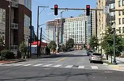 MD 594A begins at the intersection of US 29 (Georgia Avenue) and Wayne Avenue in downtown Silver Spring in Montgomery County. Wayne Avenue continues west as a county highway toward the Silver Spring station, which serves MARC's Brunswick Line and Washington Metro's Red Line, and MD 384 (Colesville Road). MD 594A heads northeast as a four-lane divided highway to Fenton Street, where the highway passes the Brigadier General Charles E. McGee Library. The highway continues east as a four-lane undivided highway out of downtown Silver Spring. MD 594A descends into the valley of Sligo Creek and intersects Dale Drive, at the corner of which the highway passes Silver Spring International Middle School, which inhabits the former campus of Montgomery Blair High School. The highway intersects Sligo Creek Parkway immediately after it crosses Sligo Creek. MD 594A ascends from the stream valley as a two-lane street to its eastern terminus at Flower Avenue. Wayne Avenue continues east to a dead end at Long Branch, a tributary of Sligo Creek.[1][2]