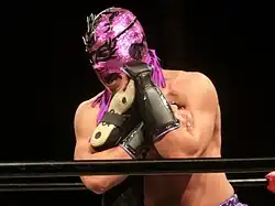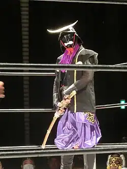 Masamune (Japanese: 政宗; born August 16, 1974)[3] is a masked Japanese professional wrestler. He currently works for Dotonbori Pro Wrestling and has also worked for Kaientai Dojo (K-Dojo) and Osaka Pro Wrestling (OPW) in Japan.[2] For several years he formed a tag team with Japanese wrestler Hideyoshi and was also part of a group known as Bad Force. Greatly influenced by lucha libre, Masamune has followed Mexican tradition for masked wrestlers, so his real name is not a matter of public record.