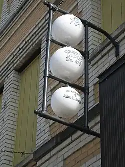 The hanging glass globe sign affixed to the facade of the Masonic Temple Lodge.