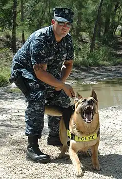 A U.S. Navy Master-at-Arms MWD Handler assigned to Naval Air Station Key West