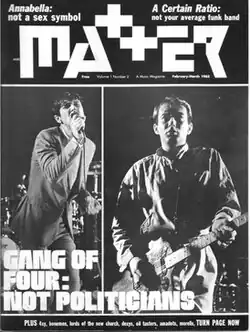 Matter was a Chicago "music magazine" (or more appropriately a punk zine) founded in January 1983.[2] It published 15 issues, one every two to five months, through June 1986. Each issue had from 20 to 40 pages of content, printed on 8-1/2" x 11" heavy, semi-gloss paper, in black and white. Starting with issue 4, the cover had one additional color, always on the front, sometimes on the back advertisement. The entire publication contained about 1000 pieces of editorial content.[1][3][4]