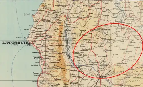 Towards the end of Ottoman rule, between 1880 and 1915, the leaders of the Mawali, including their leading family the Masharifa, sold several villages around Hama to the notable families of Hama city, including the Azm, Kaylani, Baroudi and Barazi. Among these villages were Kawkab, Qara'ah, Jneineh, Jurniyat, Kibari, Ma'an, and Taybat al-Ism.[25]