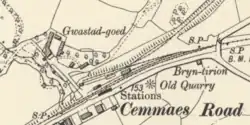 About 600 yards before Dinas Mawddwy station, the railway passed "Quarry cottages" at Maes-y-camlan. Here there was a junction, with the main line heading north-west to Dinas Mawddwy and a short branch heading due north to the main mill of the Minllyn slate quarry. A long incline carried the 2 ft 2 in (660 mm) gauge tramway down from the quarry to the mill.[24]