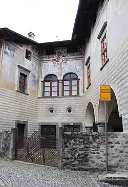 The Venosta palace is easily recognizable for the mighty tower with the function of dovecote that most likely had a symbolic connotation linked to the power and dominion of the Venosta family, embodied by the flight of doves over the territory.[8]