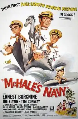 McHale's Navy is a 1964 American technicolor comedy film based on the 1962–1966 black and white television sitcom McHale's Navy starring Ernest Borgnine, Tim Conway and Joe Flynn, which had in turn originated with a one-hour anthology drama starring Borgnine entitled Seven Against the Sea. The film version was directed by series producer Edward Montagne and its supporting cast includes Carl Ballantine, Gavin MacLeod, Jean Willes, Claudine Longet, and George Kennedy.[1] The film was followed by a sequel entitled McHale's Navy Joins the Air Force which did not feature Borgnine or Carl Ballantine. A remake entitled McHale's Navy, was released in 1997 and features an appearance by Ernest Borgnine playing a 75-year old McHale. The filming location for New Caledonia is the same as the one used in the series. For more information on the main characters see the TV series McHale's Navy. The movie was released on DVD for Region 1 on January 31, 2011.[2]