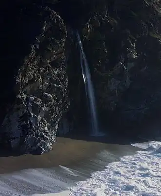 There are a number of waterfalls in the basin of McWay Creek. The most well-known is McWay Falls, which spills 80 feet (24 m) onto a sandy beach at Waterfall Cove.[6] A smaller waterfall, the two-tier, 30-foot (9.1 m) McWay Creek Falls is located upstream of the Highway 1 culvert and the parking area.[7] A small 30-foot (9.1 m) cascade, Canyon Trail Falls, is fed by the South Fork just before it meets McWay Creek.[8] As most of the creek is steep and rocky, there are many unnamed waterfalls that also exist. McWay Creek is fed by a number of springs in McWay Canyon and flows year round.[6]