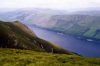 Meall na Teanga is situated on the northern side of Loch Lochy and is closely associated with the adjacent Munro of Sròn a' Choire Ghairbh which lies two kilometres to the north across the Cam Bealach ("crooked pass"). The two mountains are usually ascended together.[2] Meall na Teanga is seen prominently from the A82 road on the opposite bank of Loch Lochy, showing steep slopes which have the conifer plantations of the South Laggan Forest below the 300 metre contour.