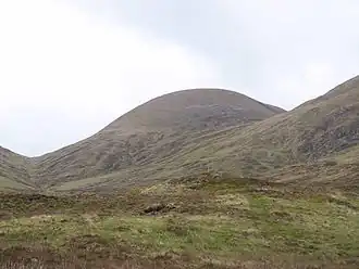 The hill just qualifies as a Munro by four metres, reaching a height of 918 m (3,012 ft). In the original 1891 version of Munro's Tables, Meall na Teanga was listed as a subsidiary "Top" of Sròn a' Choire Ghairbh. It was promoted to Munro status when the tables were updated in 1921, despite continuing doubts as to whether it had sufficient height.[3] The hill's name translates from the Gaelic as "Hill of the Tongue". This refers to one of the hill's ridges: either the long tongue-like western ridge which curves round two fine corries, or the steep buttressing spur which rises from the loch to the summit.[4] The hill is sometimes referred to in the anglified form of "Tango".