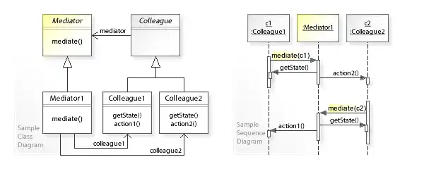 Assuming that Colleague1 wants to interact with Colleague2 (to update/synchronize its state, for example), Colleague1 calls mediate(this) on the Mediator1 object, which gets the changed data from Colleague1 and performs an action2() on Colleague2.