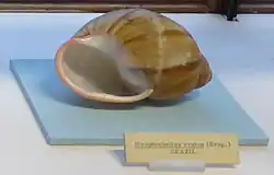 Shell of Megalobulimus ovatus on display at the Museo Civico di Storia Naturale di Milano