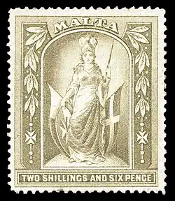 Melita first appeared on stamps in 1899. A 2s/6d olive-grey stamp depicted her holding a sword and a shield, the latter emblazoned with the Maltese cross. In the background were the flags of Malta and of the Order.[2] This stamp was reissued with a different watermark in 1919, and remained in use until it was replaced by the 1922 Melita issue.[3] Special printings of the 1899 design, sometimes in new colours or watermarks, were also issued with overprints for revenue purposes between 1902 and 1908.[4]