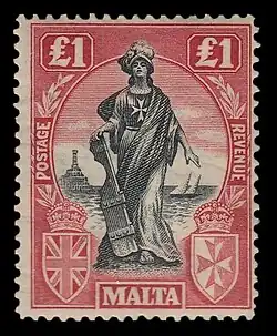 Caruana Dingli's design depicts Melita as a robed and helmeted figure holding a rudder, representing Malta as being in control of her own destiny.[8] The background contains a seascape, with the lighthouse near Fort Saint Elmo and a Gozo boat visible. Shields depicting the Union Jack and a colonial badge representing Malta are located at the bottom of the design.[5]