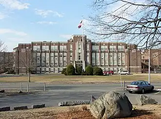The building on West Emerson Street quickly became too small for the growing community and so at the town meeting held on February 24, 1896, the town allocated $100,000 for the building of a new high school. The town selected a lot of land known as the "Old Burial Ground" on Main Street across from the Central Fire Station as the location for the new school building. On August 1, 1898, an additional $3,000 was appropriated for site work around the building. The school was dedicated on September 17, 1898 and at the time, was one of the "finest school buildings to be found in New England".[5] Two additional wings were added to the main building and opened in 1909.[6]